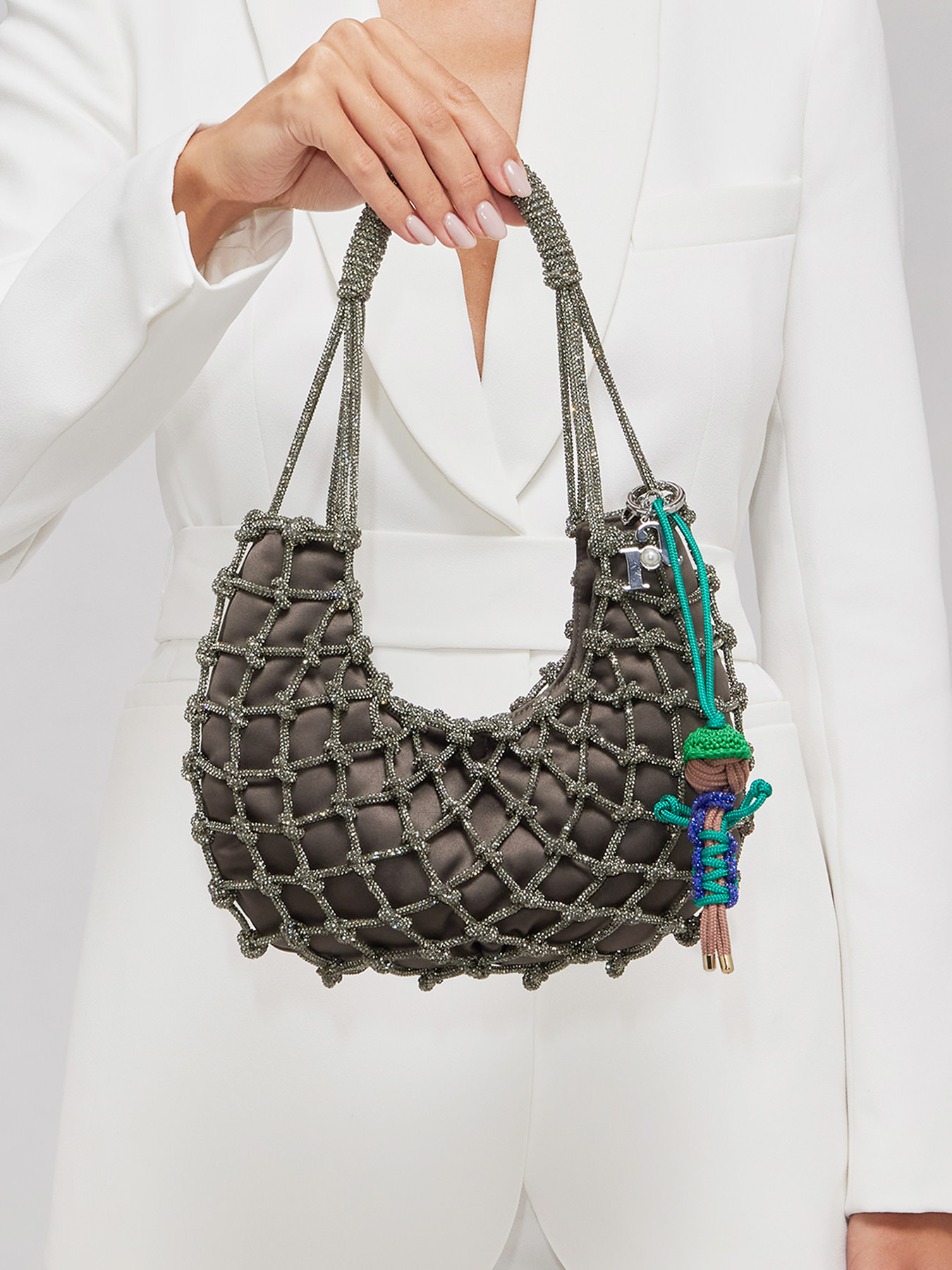 The "Charm Signorino" combines joyful multicolored threads, crystal wire, and faux pearl into a stylish accent for any ensemble.