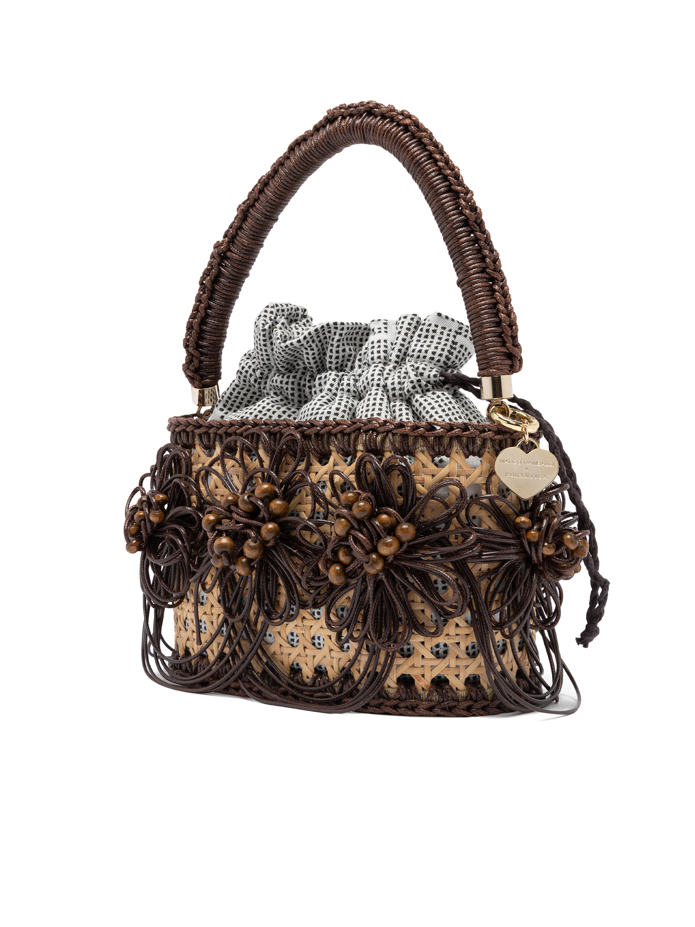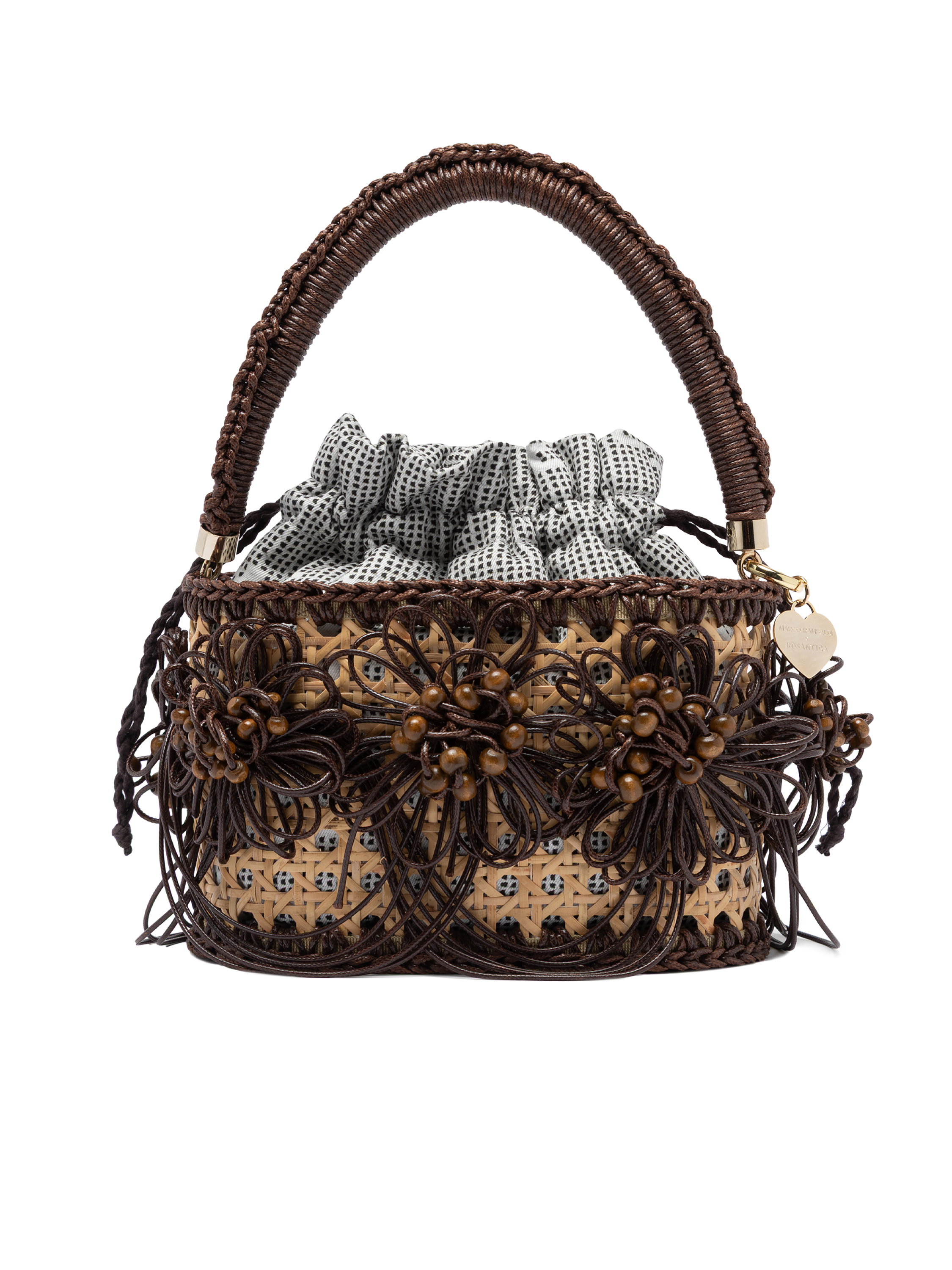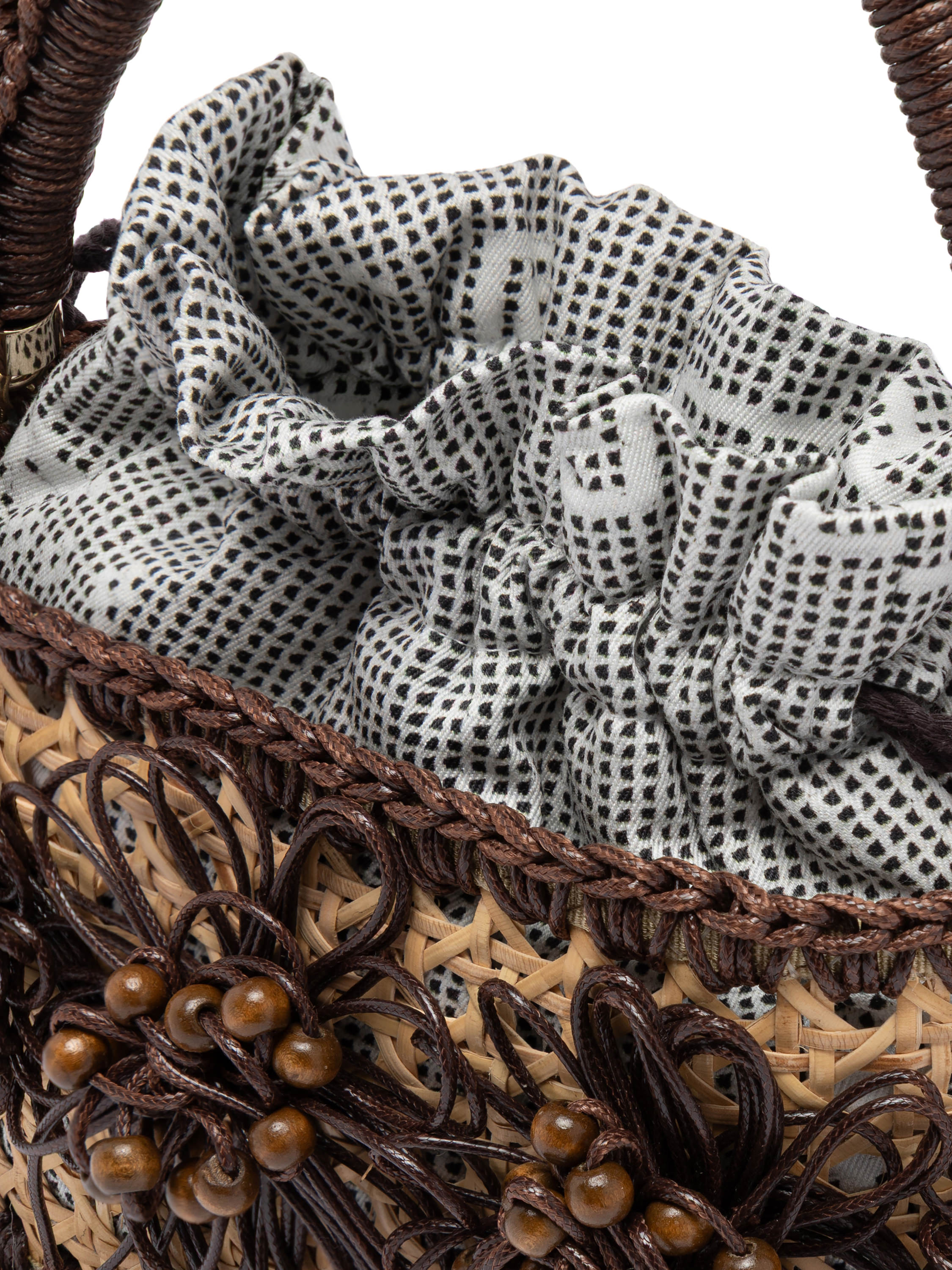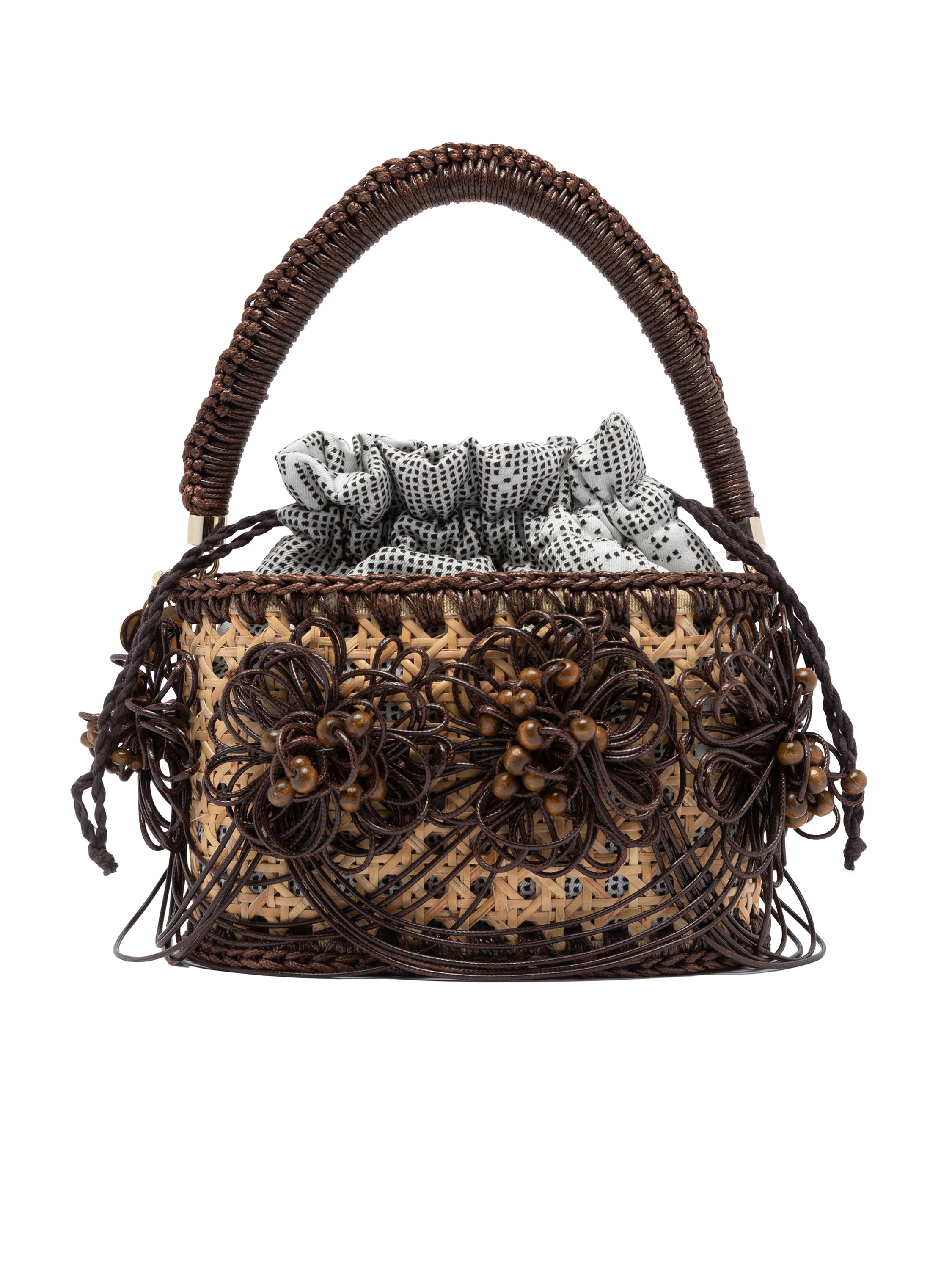 The Holli Momo, born from the union between Marco Rambaldi and Rosantica, combines material research with iconic design. Crafted in Vienna straw, leather tubular elements, and wooden beads, it expresses a perfect balance between nature, craftsmanship, and contemporary luxury. Textures intertwine to create a sophisticated and unexpected effect.