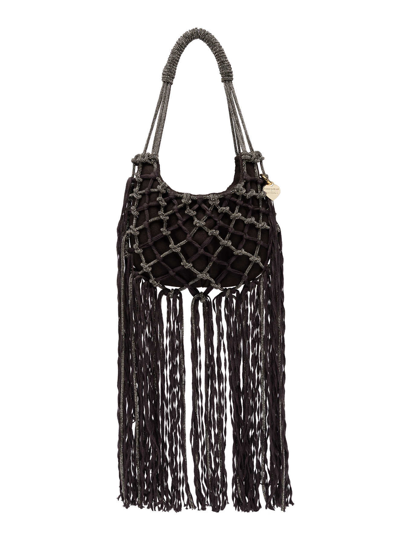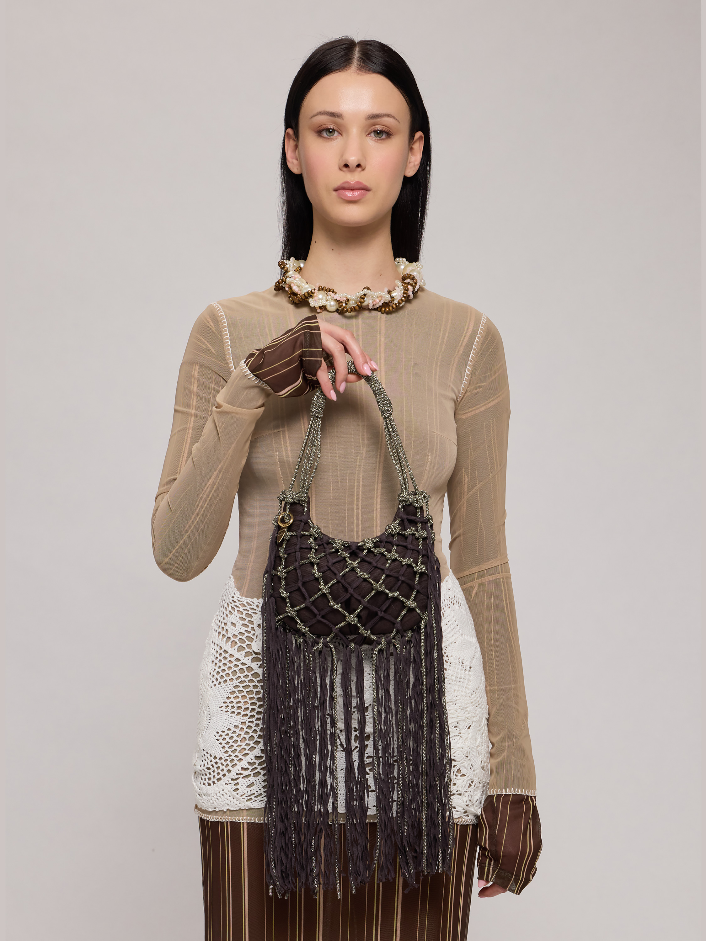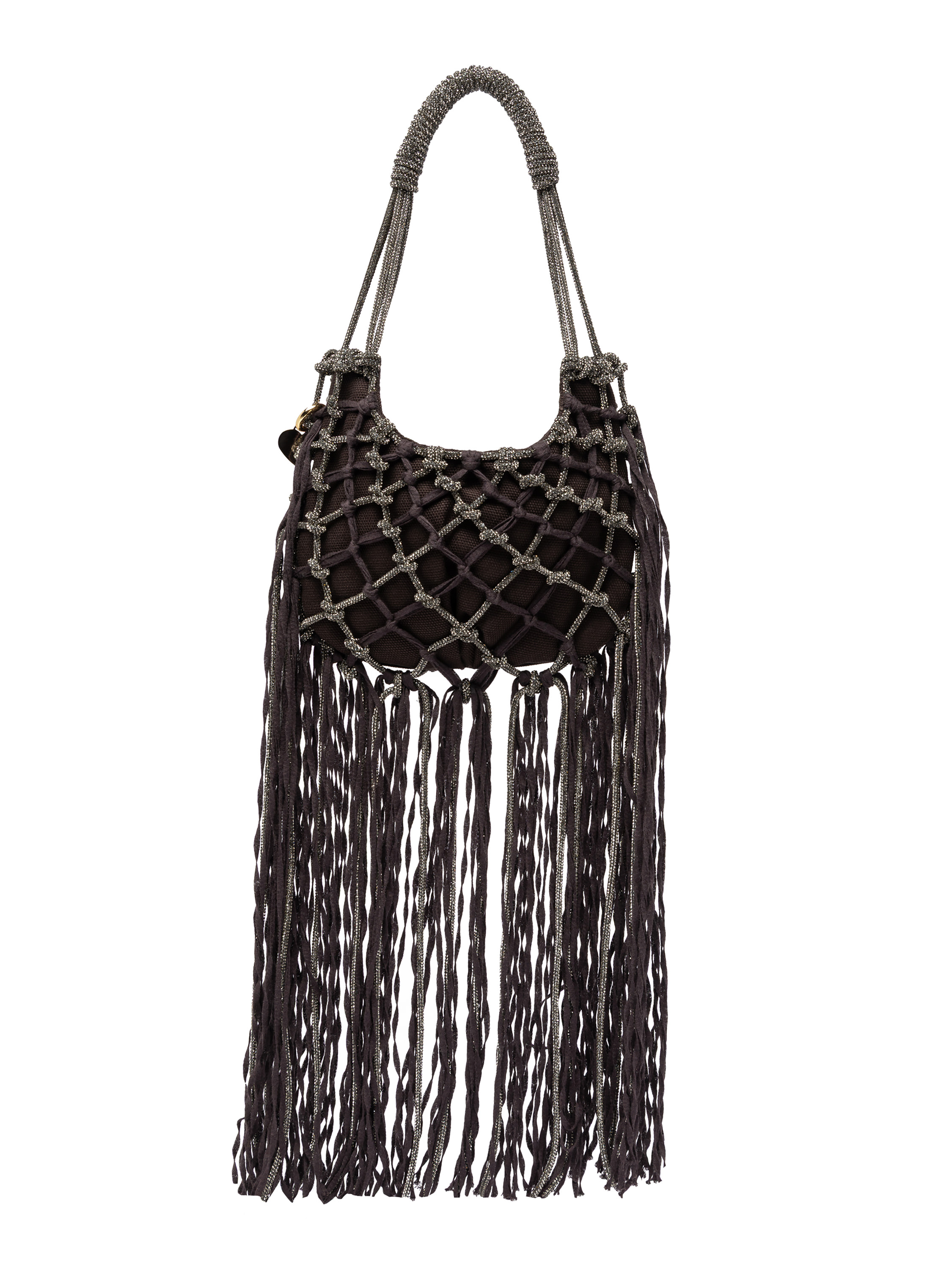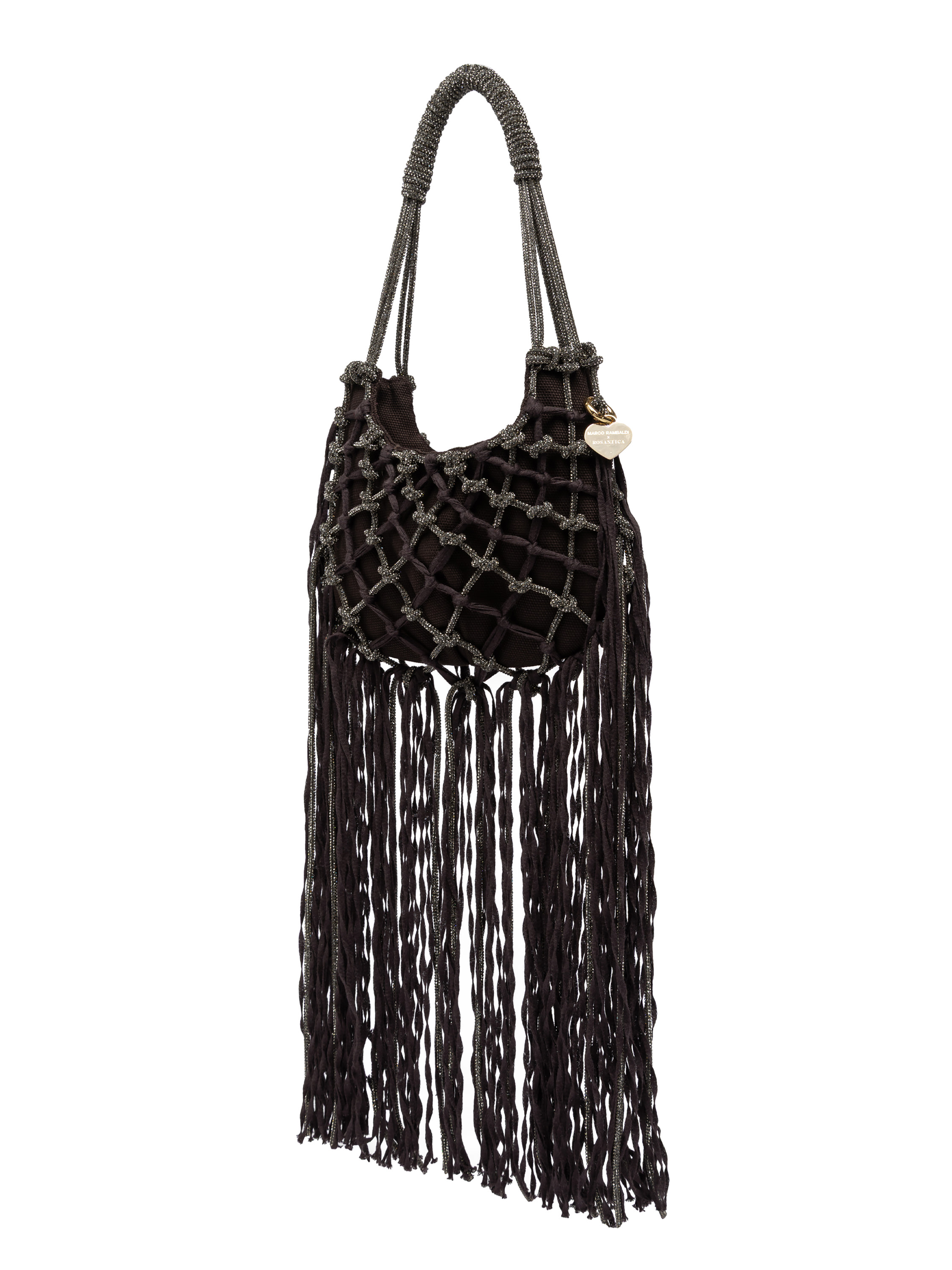 The Mini Fuji, created through the collaboration between Marco Rambaldi and Rosantica, features refined yarn fringes that create movement and three-dimensionality. A lightweight yet characterful accessory where textile craftsmanship becomes the protagonist, blending seamlessly with Rosantica’s elegant structure.