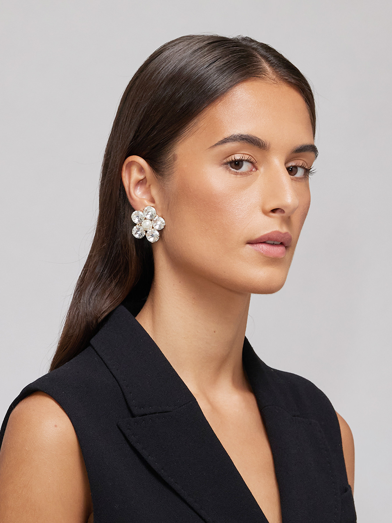 The "Matera" earrings feature crystals and faux pearls with gold-toned brass. Their delicate yet striking design adds sparkle and refinement to any look.