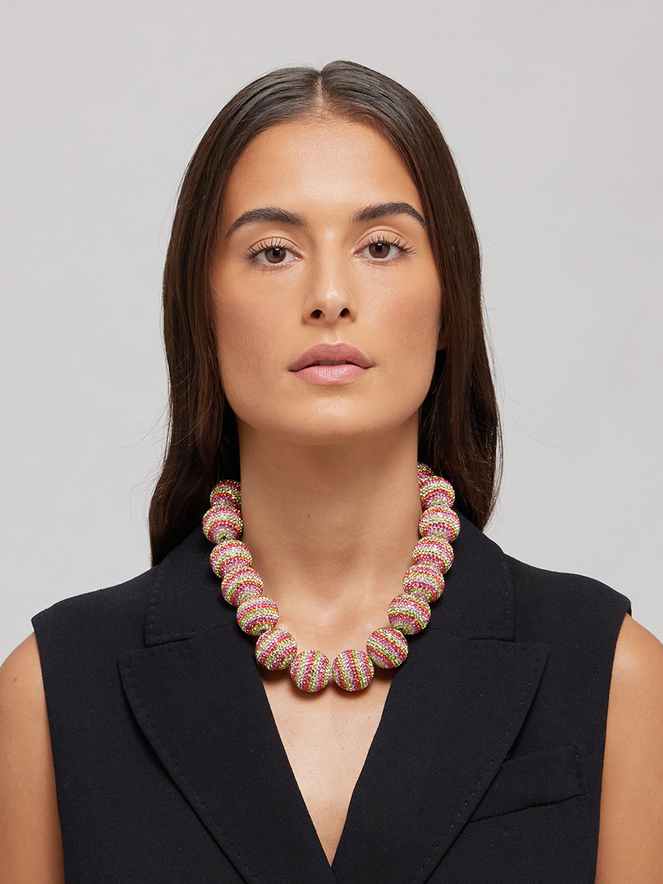 The "Iris" necklace combines multicolored crystals with gold-toned brass, bringing Italian craftsmanship and playful elegance to any look.